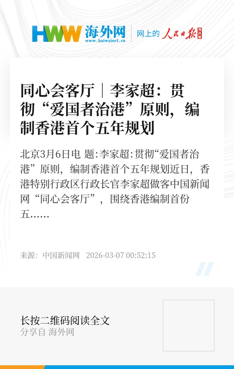 中新网北京3月6日电 题:李家超:贯彻“爱国者治港”原则,编制香港首个五年规划