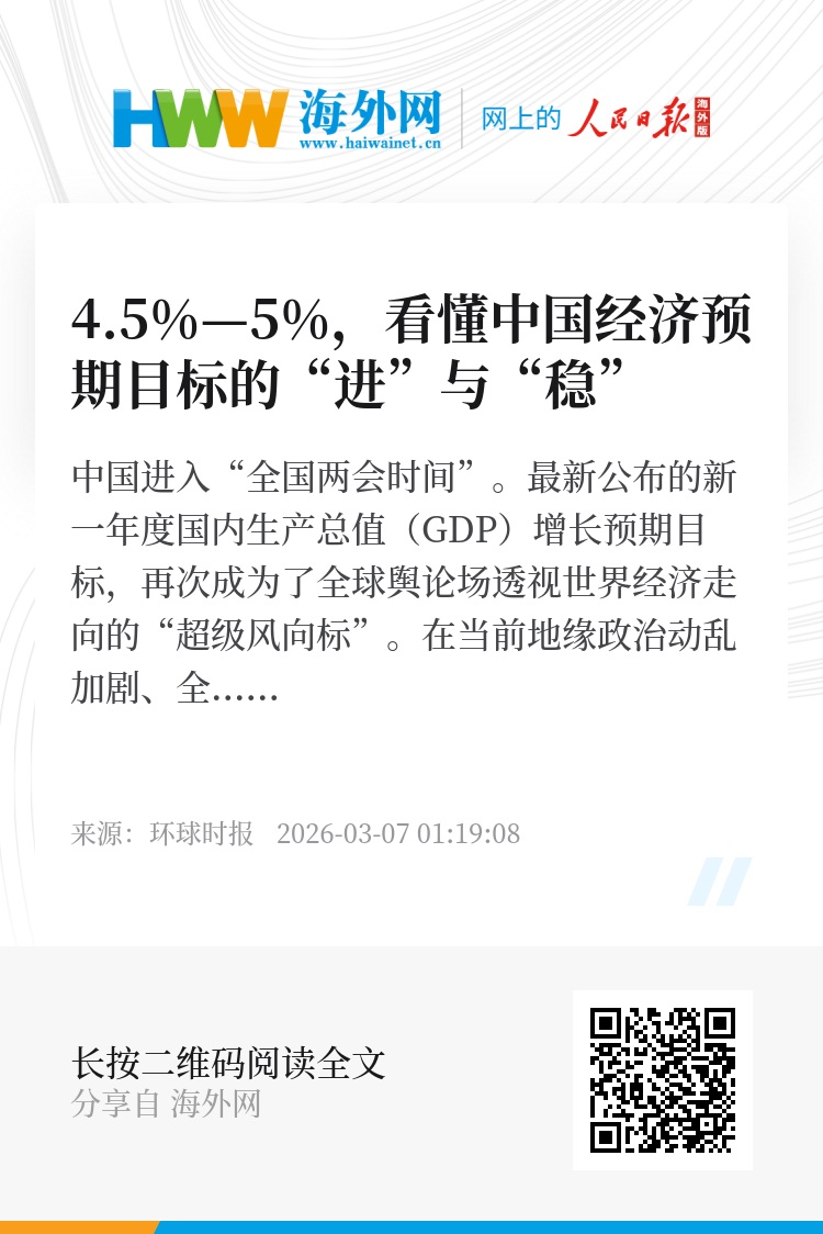 中国进入“全国两会时间”。最新公布的新一年度国内生产总值(GDP)增长预期目标,再次成为了全球舆论场透视世界经济走向的“超级风向标”。在当前地缘政治动乱加剧、全球经济复苏动力不足的宏观背景下,中国这份经济蓝图所展现出的战略定力、政策效力、发展活力与治理能力,不仅是对“中国经济见顶论”的有力回击,更是动荡世界中极其稀缺的“确定性源泉”。