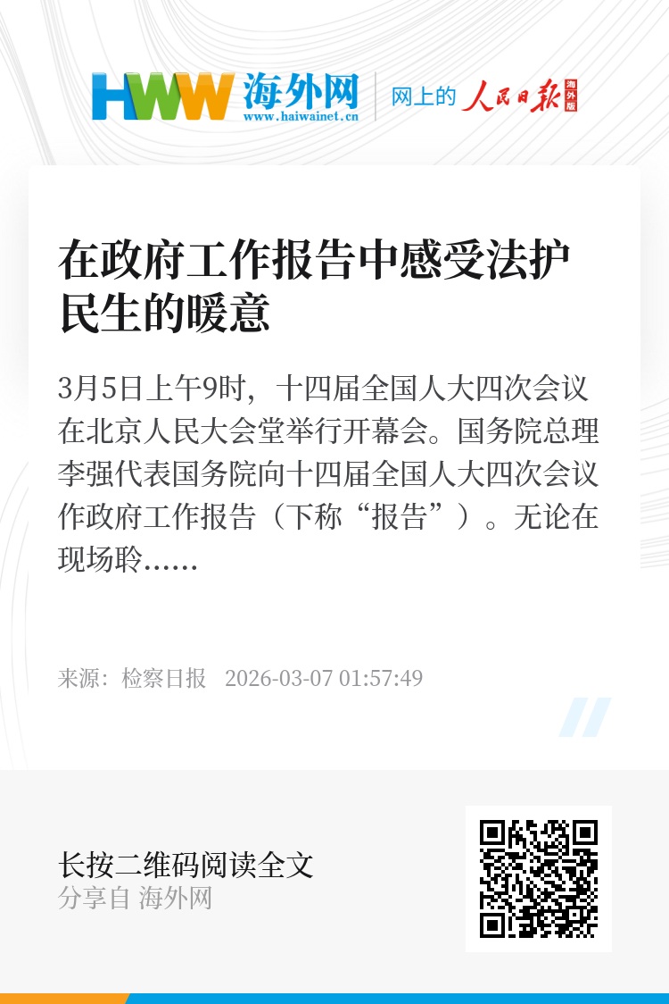 3月5日上午9时,十四届全国人大四次会议在北京人民大会堂举行开幕会。国务院总理李强代表国务院向十四届全国人大四次会议作政府工作报告(下称“报告”)。无论在现场聆听报告,还是通过电视、网络收听收看直播,都能从中感受到报告中透露出的浓浓为民情怀和法治守护民生的暖意。