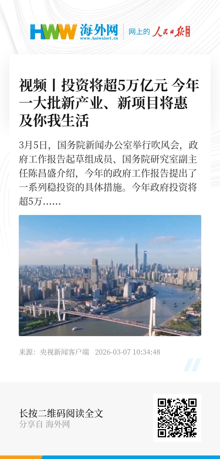 3月5日,国务院新闻办公室举行吹风会,政府工作报告起草组成员、国务院研究室副主任陈昌盛介绍,今年的政府工作报告提出了一系列稳投资的具体措施。今年政府投资将超5万亿元,一大批新产业、新项目将惠及百姓生活。