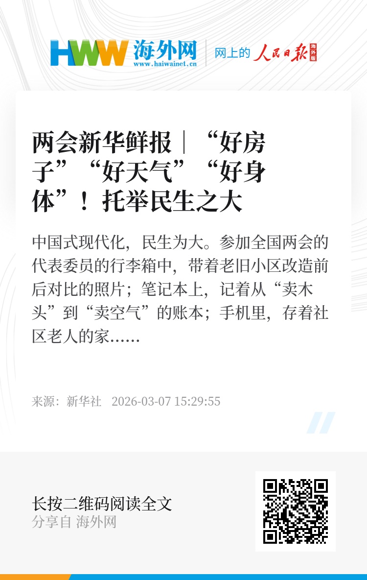 参加全国两会的代表委员的行李箱中,带着老旧小区改造前后对比的照片;笔记本上,记着从“卖木头”到“卖空气”的账本;手机里,存着社区老人的家庭医生签约表……这些关乎“好房子”“好天气”“好身体”的“小确幸”,是“民生为大”的生动注脚。