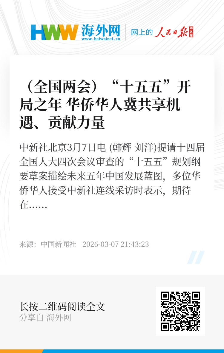 中新社北京3月7日电 (韩辉 刘洋)提请十四届全国人大四次会议审查的“十五五”规划纲要草案描绘未来五年中国发展蓝图,多位华侨华人接受中新社连线采访时表示,期待在“十五五”期间发挥自身优势,共享发展机遇,助力中外互利共赢向更高水平迈进。