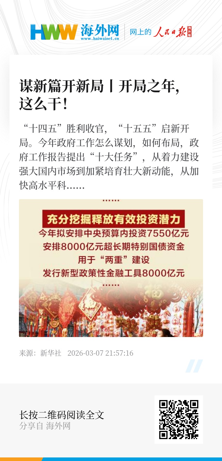 “十四五”胜利收官,“十五五”启新开局。今年政府工作怎么谋划,如何布局,政府工作报告提出“十大任务”,从着力建设强大国内市场到加紧培育壮大新动能,从加快高水平科技自立自强到更大力度保障和改善民生……勾勒出开局之年政府工作“施工图”,目标科学务实、政策精准给力。跟随海报,一起感受开局之年的新图景新篇章。