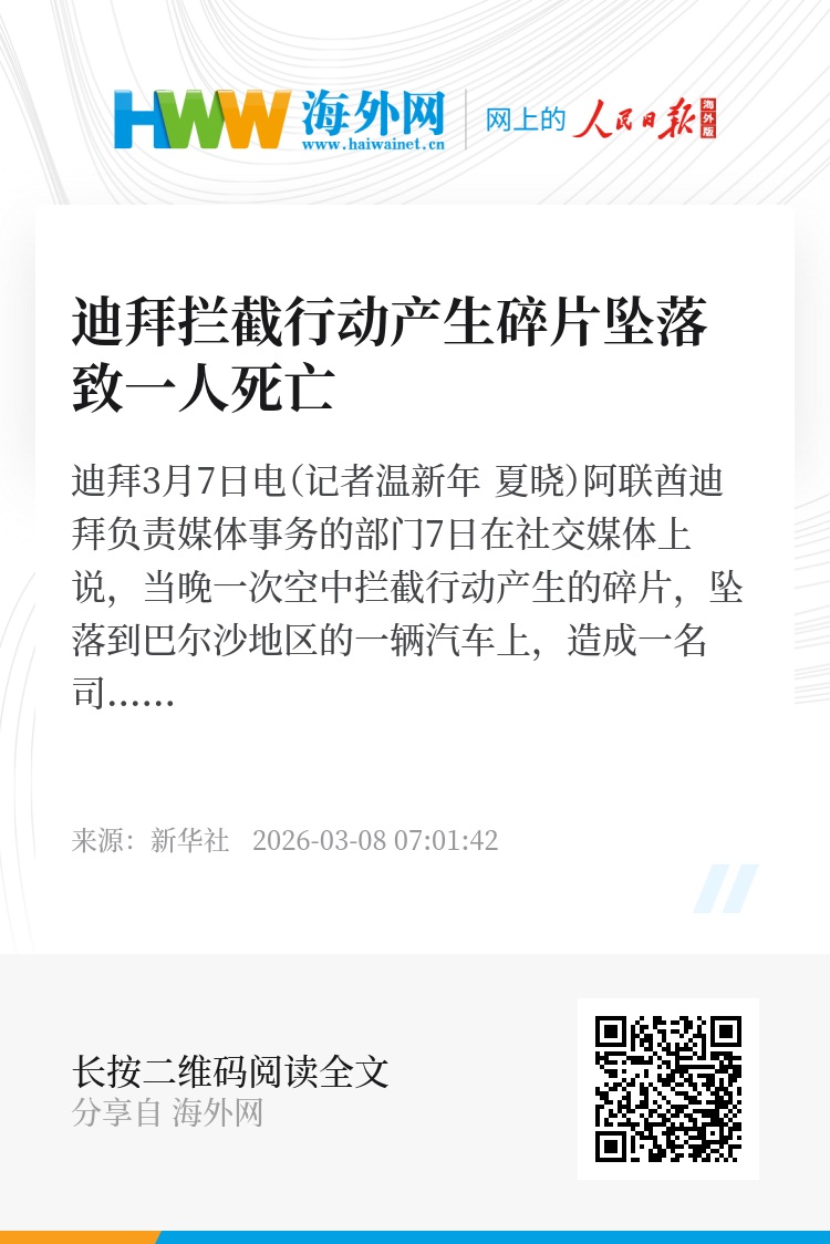 新华社迪拜3月7日电(记者温新年 夏晓)阿联酋迪拜负责媒体事务的部门7日在社交媒体上说,当晚一次空中拦截行动产生的碎片,坠落到巴尔沙地区的一辆汽车上,造成一名司机死亡。