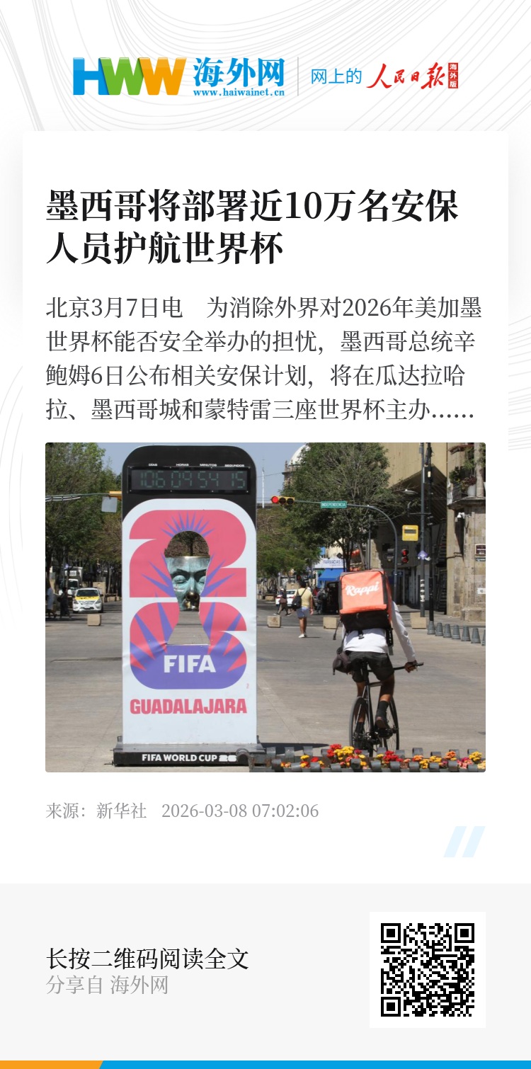 新华社北京3月7日电 为消除外界对2026年美加墨世界杯能否安全举办的担忧,墨西哥总统辛鲍姆6日公布相关安保计划,将在瓜达拉哈拉、墨西哥城和蒙特雷三座世界杯主办城市部署近10万名安保人员,以保障球迷安全。