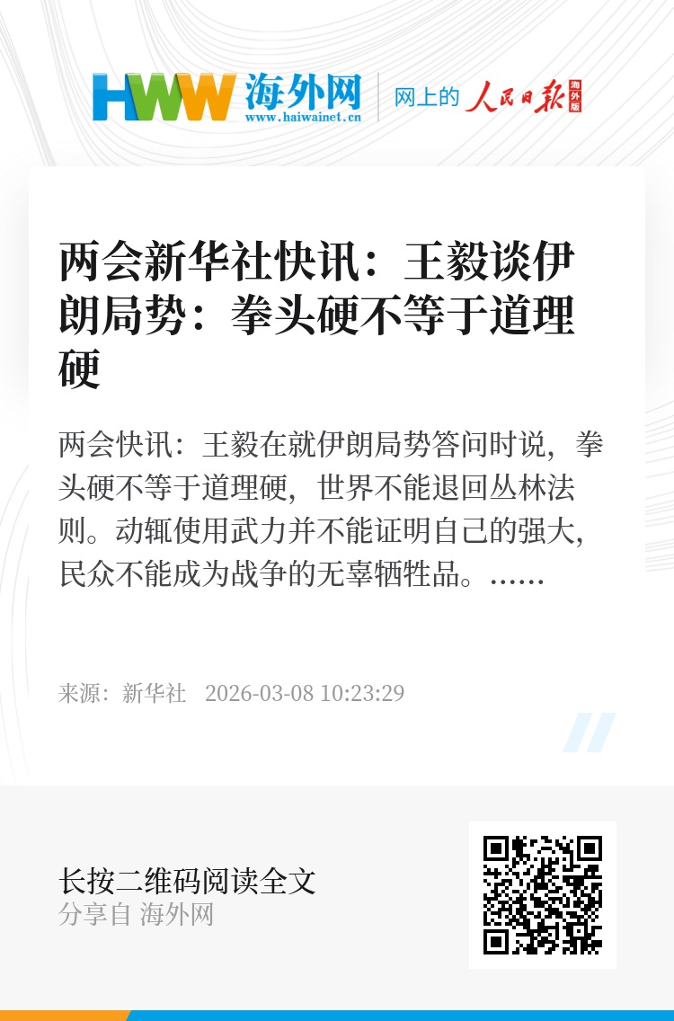 两会新华社快讯:王毅在就伊朗局势答问时说,拳头硬不等于道理硬,世界不能退回丛林法则。动辄使用武力并不能证明自己的强大,民众不能成为战争的无辜牺牲品。