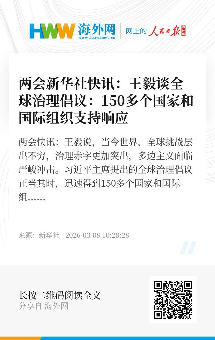 两会新华社快讯:王毅说,当今世界,全球挑战层出不穷,治理赤字更加突出,多边主义面临严峻冲击。习近平主席提出的全球治理倡议正当其时,迅速得到150多个国家和国际组织支持响应。