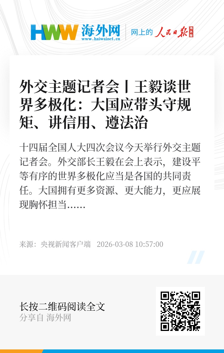 外交部长王毅在会上表示,建设平等有序的世界多极化应当是各国的共同责任。大国拥有更多资源、更大能力,更应展现胸怀担当,带头守规矩、讲信用、遵法治。中国愿继续做变革世界的建设性力量,同各国一道,共同迎接多极世界的到来。