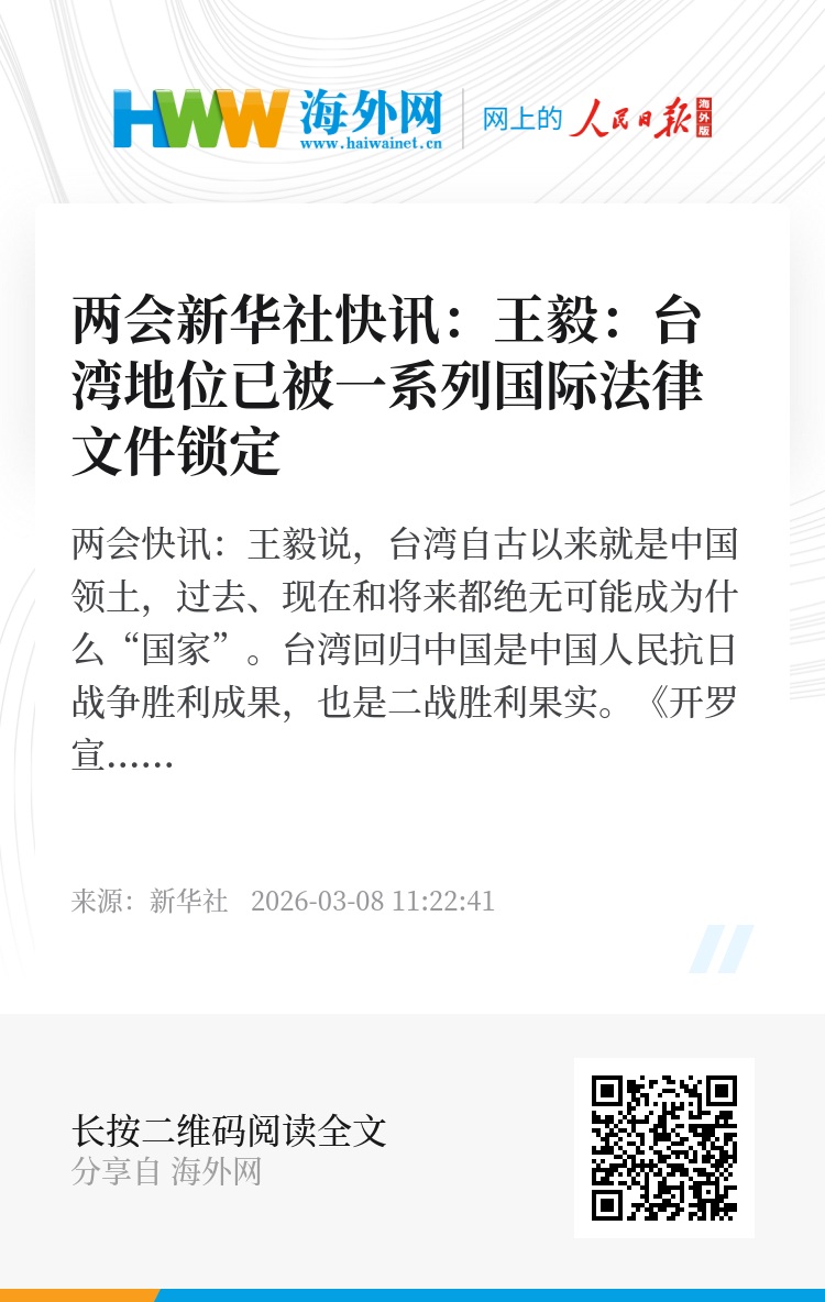 两会新华社快讯:王毅说,台湾自古以来就是中国领土,过去、现在和将来都绝无可能成为什么“国家”。台湾回归中国是中国人民抗日战争胜利成果,也是二战胜利果实。《开罗宣言》、《波茨坦公告》、《日本投降书》、联大第2758号决议等一系列国际法律文件都已将台湾地位牢牢锁定。任何在国际上制造“两个中国”“一中一台”的图谋都注定失败。