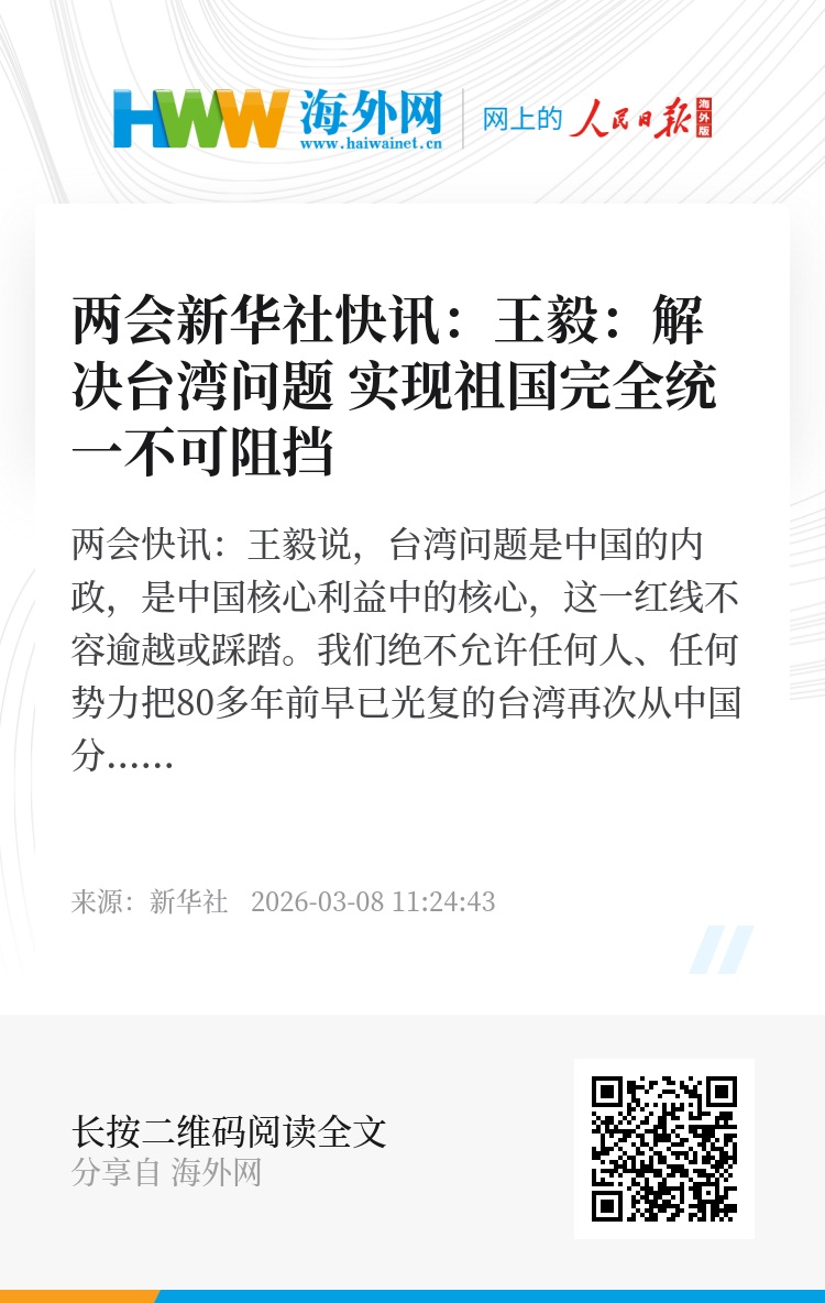 两会新华社快讯:王毅说,台湾问题是中国的内政,是中国核心利益中的核心,这一红线不容逾越或踩踏。我们绝不允许任何人、任何势力把80多年前早已光复的台湾再次从中国分裂出去。国际社会已形成坚持一个中国的压倒性共识。解决台湾问题,实现祖国完全统一的历史进程不可阻挡。顺之者昌,逆之者亡。