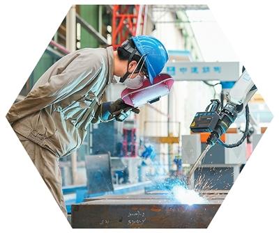 2025年7月8日,四川省眉山市天府新区中建钢构(四川)有限公司加工车间内,工人正配合机器人焊接赶制钢构产品。