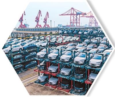 2月14日,江苏省苏州港太仓港区国际集装箱码头,一批新能源汽车即将通过专用框架运输方式装运出海。