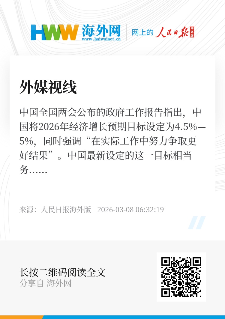 中国全国两会公布的政府工作报告指出,中国将2026年经济增长预期目标设定为4.5%—5%,同时强调“在实际工作中努力争取更好结果”。中国最新设定的这一目标相当务实,它标志着经济增长更加注重质量优先,强调通过科技创新、大力提振消费推动经济高质量发展。同时,今年设定的经济增长目标也留出了更多政策空间,有利于平衡经济结构。