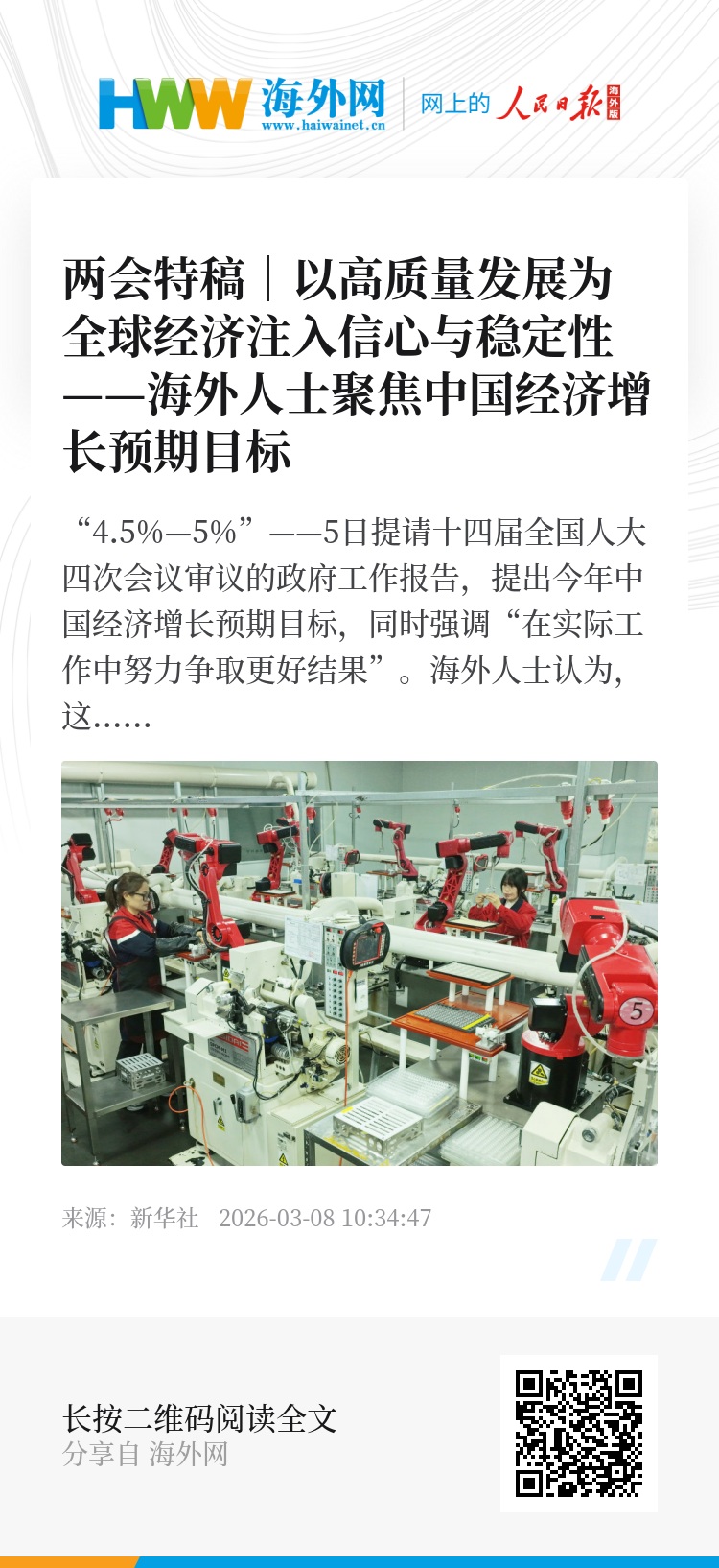 “4.5%—5%”——5日提请十四届全国人大四次会议审议的政府工作报告,提出今年中国经济增长预期目标,同时强调“在实际工作中努力争取更好结果”。海外人士认为,这一目标积极务实,既寻求以合理增速稳住基本盘,又为深化改革预留弹性空间。在变乱交织、地区冲突加剧的国际形势中,中国以自身高质量发展的确定性为全球市场注入宝贵信心。