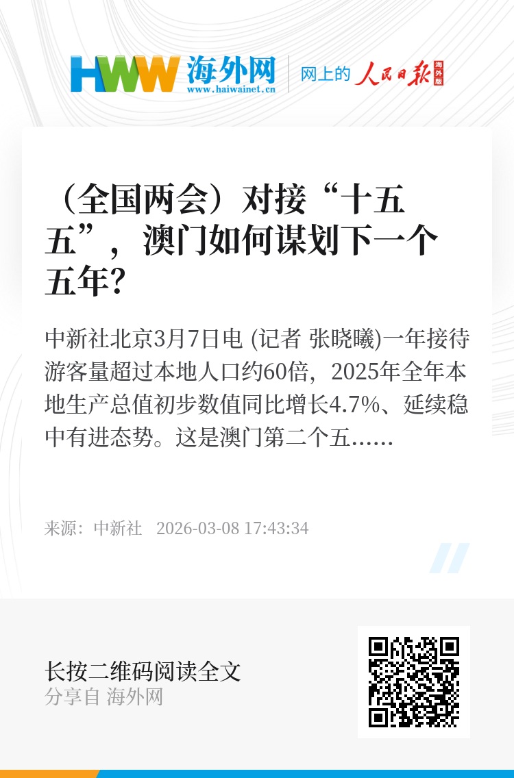 中新社北京3月7日电 (记者 张晓曦)一年接待游客量超过本地人口约60倍,2025年全年本地生产总值初步数值同比增长4.7%、延续稳中有进态势。这是澳门第二个五年规划期间交出的“成绩单”,站在新起点,当地如何谋划下一个五年?