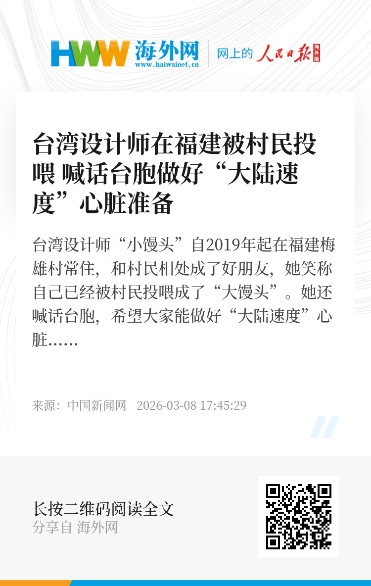 台湾设计师“小馒头”自2019年起在福建梅雄村常住,和村民相处成了好朋友,她笑称自己已经被村民投喂成了“大馒头”。她还喊话台胞,希望大家能做好“大陆速度”心脏准备,一起加入大陆的乡村振兴事业。(记者陈欣怡)