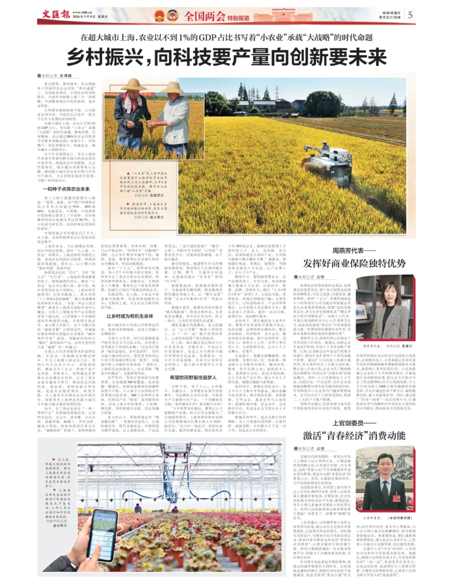 在今年全国两会上,来自上海的代表委员带着田野实践与科创攻坚的双重思考,围绕农业科技赋能、生态价值转化、城乡融合发展等核心议题,解码超大城市农业农村现代化的可行路径,为全国探索提供可复制、可推广的经验启示。