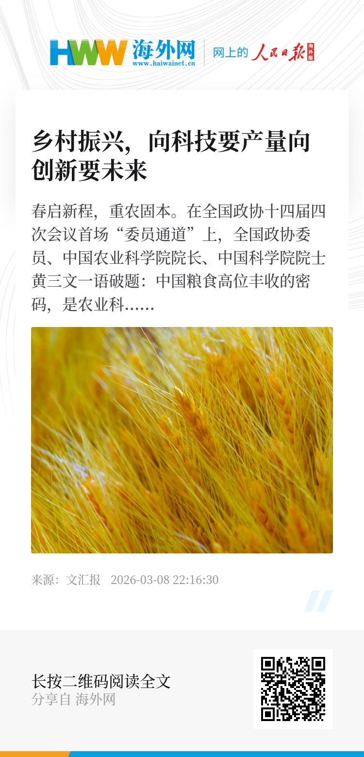 春启新程,重农固本。在全国政协十四届四次会议首场“委员通道”上,全国政协委员、中国农业科学院院长、中国科学院院士黄三文一语破题:中国粮食高位丰收的密码,是农业科技。