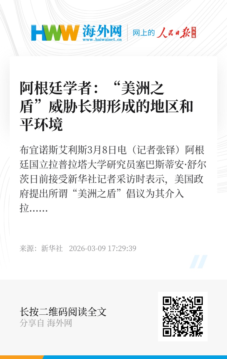 新华社布宜诺斯艾利斯3月8日电(记者张铎)阿根廷国立拉普拉塔大学研究员塞巴斯蒂安·舒尔茨日前接受新华社记者采访时表示,美国政府提出所谓“美洲之盾”倡议为其介入拉美国家内部事务提供新的借口和便利,威胁该地区长期形成的和平环境。