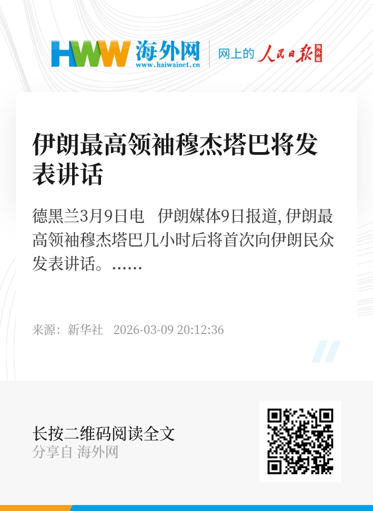 新华社德黑兰3月9日电 伊朗媒体9日报道,伊朗最高领袖穆杰塔巴几小时后将首次向伊朗民众发表讲话。
