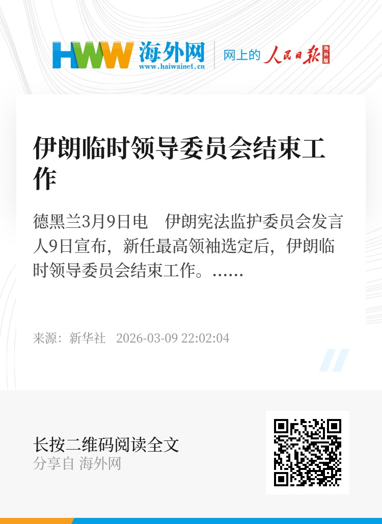 新华社德黑兰3月9日电 伊朗宪法监护委员会发言人9日宣布,新任最高领袖选定后,伊朗临时领导委员会结束工作。