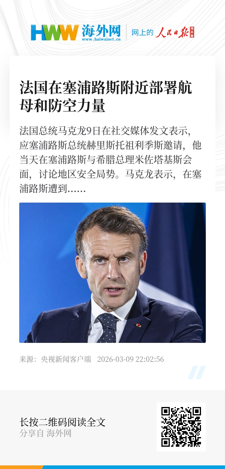 马克龙当天在塞浦路斯举行的新闻发布会上还表示,法国在中东地区的军事存在将动员8艘护卫舰、两艘两栖攻击舰以及“戴高乐”号航空母舰,以应对地区安全局势。他表示,“戴高乐”号航空母舰及其航母打击群目前已部署在塞浦路斯附近。(总台记者 朱雪松)