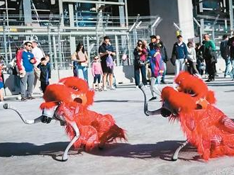 在西班牙巴塞罗那足球俱乐部,两只披着舞狮盛装的机器狗正在表演。