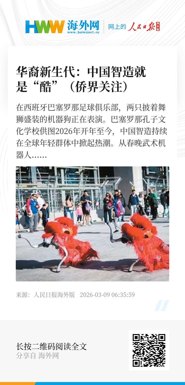2026年开年至今,中国智造持续在全球年轻群体中掀起热潮。从春晚武术机器人引爆海外社交平台,到新能源汽车、智能机器人、潮玩科技成为海外年轻一代“新标配”,中国科技正以硬核实力与文化魅力,赢得全球“Z世代”青睐。他们用订单与口碑证明:中国智造,既是科技竞争力,也是新时代的文化吸引力。海外华裔新生代是中国智造的忠实拥趸。在接受本报记者采访时,几位华裔新生代代表表示,中国智造产品迭代速度快、性价比高、设计人性化、便捷高效,把科技和生活结合得很自然,代表未来的方向,非常“酷”!
