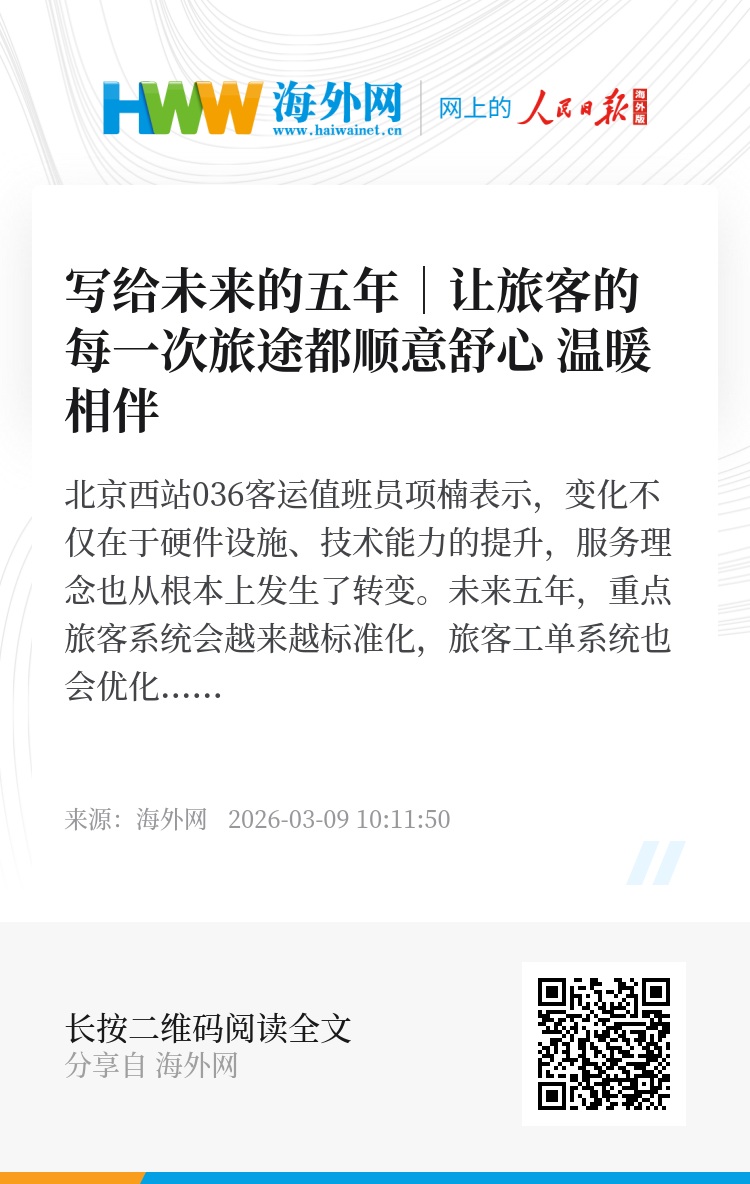 “这五年,北京西站的变化巨大。线上购票逐渐替代线下购票,排队的旅客少了,同时旅客对现在出行舒适度要求越来越高。”北京西站036客运值班员项楠表示,变化不仅在于硬件设施、技术能力的提升,服务理念也从根本上发生了转变。未来五年,重点旅客系统会越来越标准化,旅客工单系统也会优化。“希望未来以智慧赋能客运服务,以温情守护出行全程,旅客的每一段旅行都顺意舒心,我们能够温情陪伴。”
