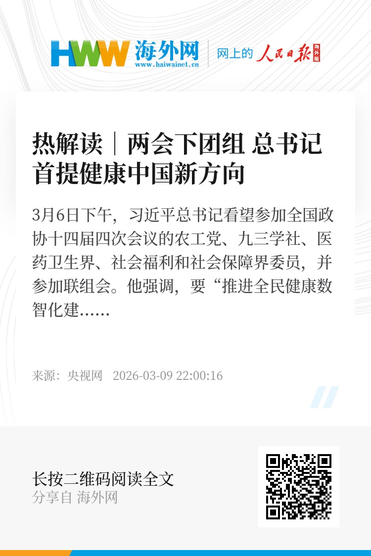 3月6日下午,习近平总书记看望参加全国政协十四届四次会议的农工党、九三学社、医药卫生界、社会福利和社会保障界委员,并参加联组会。他强调,要“推进全民健康数智化建设”,“推动‘十五五’时期健康中国建设取得决定性进展”。
