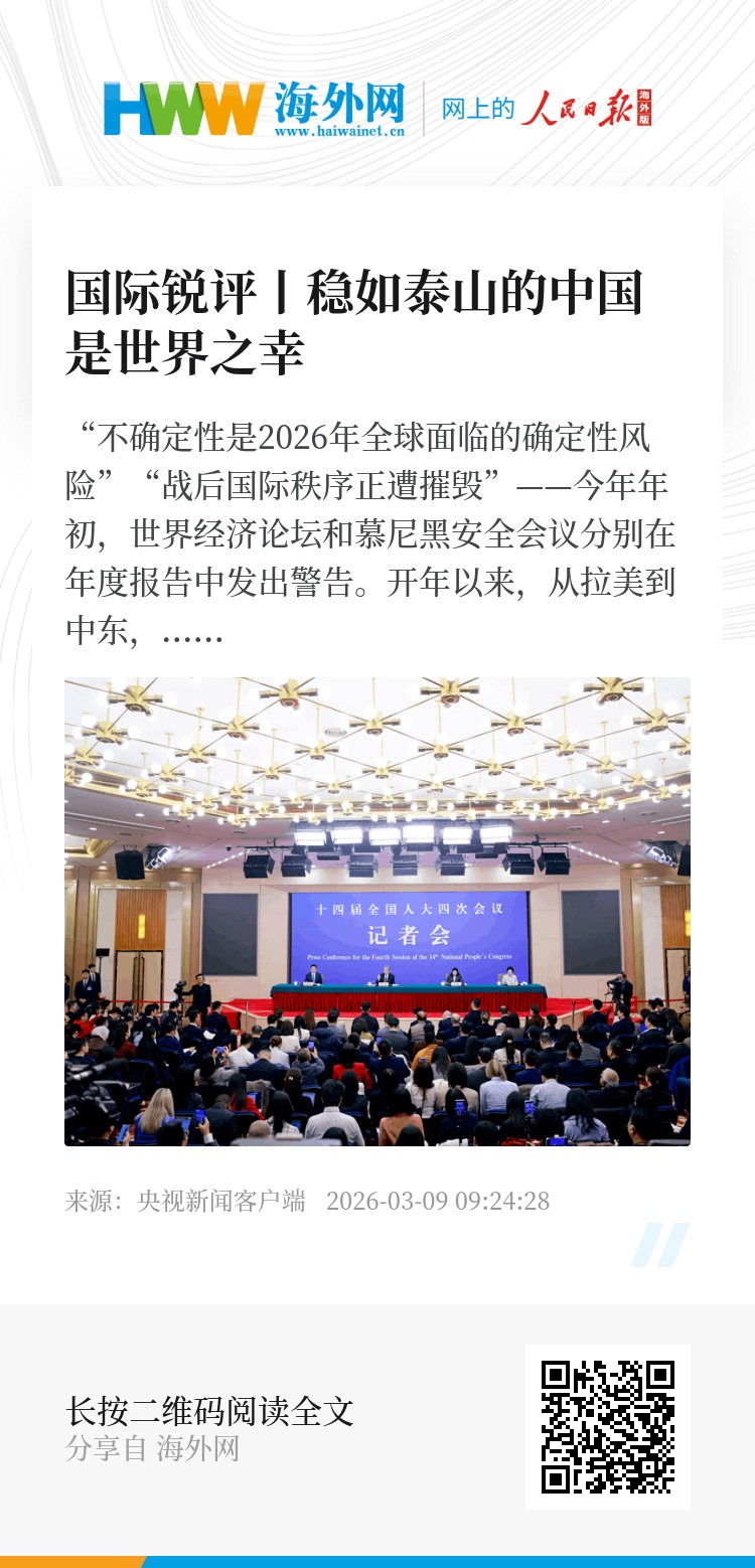 中国是这么说的,也是这么做的。以过去一年为例,从发起成立国际调解院,到斡旋柬泰冲突,再到以上合组织、金砖国家机制等平台推动全球南方自立自强,中国为维护世界和平奔走,为完善全球治理尽力。最近,伊朗局势成为国际焦点。中国的态度很明确,那就是呼吁各方“停火止战”。中国同中东多国开展密切沟通,将派特使赴中东斡旋,并提出正确处理伊朗以及中东相关问题的五项原则,推动紧张局势降温。法国《费加罗报》网站指出,中国在变乱交织的世界中作为稳定一极的角色日益凸显。