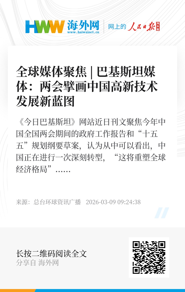 《今日巴基斯坦》网站近日刊文聚焦今年中国全国两会期间的政府工作报告和“十五五”规划纲要草案,认为从中可以看出,中国正在进行一次深刻转型,“这将重塑全球经济格局”。