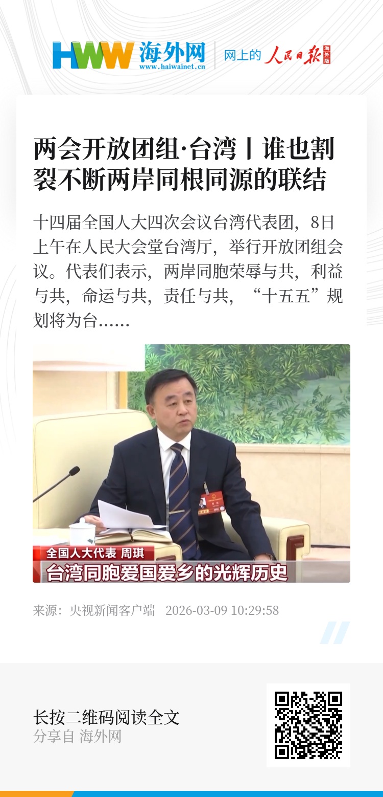 总台央视记者 朱若梦:台湾省全国人大代表大多是出生在祖国大陆的台湾省籍同胞,长期以来在推动国家现代化事业以及两岸关系和平发展方面作出突出贡献。从今天的发言中可以明显感受到,“十五五”规划对台胞而言机遇广阔,而两岸和平发展、交流合作是大势所趋,不可阻挡。