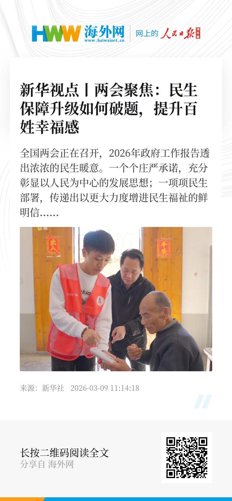 全国两会正在召开,2026年政府工作报告透出浓浓的民生暖意。一个个庄严承诺,充分彰显以人民为中心的发展思想;一项项民生部署,传递出以更大力度增进民生福祉的鲜明信号。