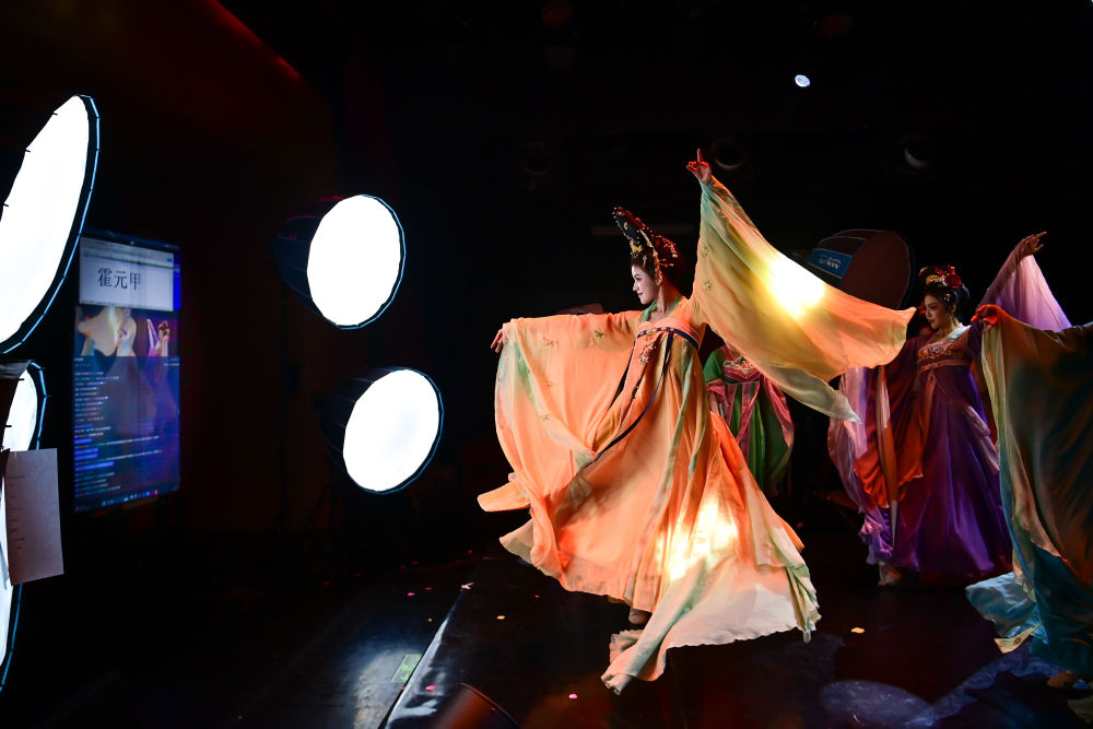 陕西省歌舞剧院的舞蹈演员在直播间进行“团播”表演(2026年1月15日摄)。