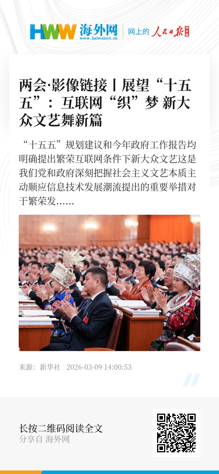 2026年3月6日,全国政协委员冯晓婷在小组讨论上发言。她说,每个人都是新大众文艺的参与者、建设者、受益者。健康可持续的新大众文艺生态,是多元网络平台与无数用户协同共建的结果。它既能让普通人的温暖瞬间破圈传播,让善意被更多人看见,也能沉淀出有思想、有内涵的精品力作,以优质内容引领时代价值。
