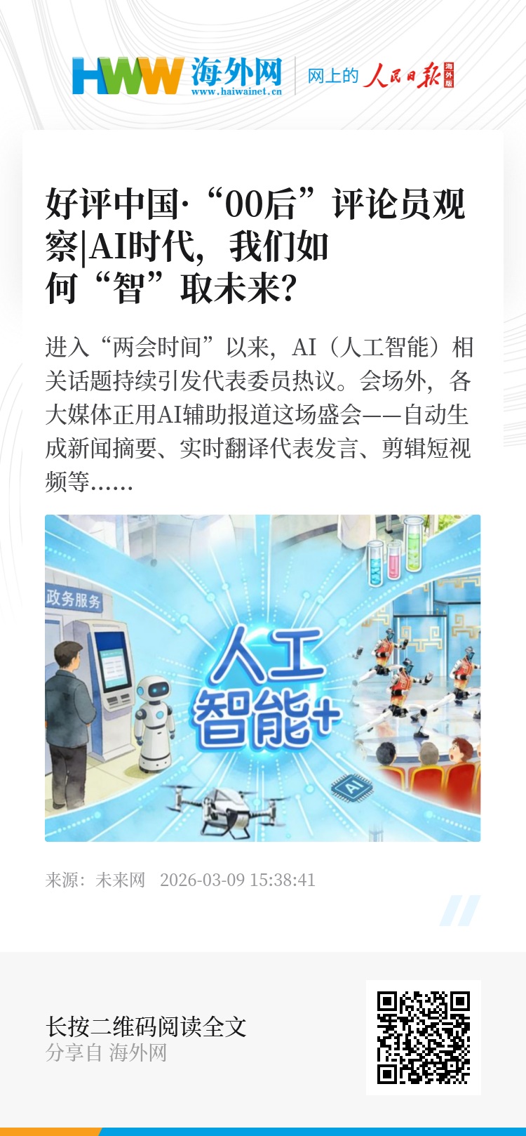 AI可以帮我们检索资料,但不能替我们思考;可以帮我们生成画面,但不能替我们感受。今年全国两会为AI高质量发展和高水平安全进一步划定方向、筑牢防线,正是要让技术向善、让发展更有序。与AI一同成长,我们应保持清醒、守住本心,把AI用成“翅膀”,而非“拐杖”。正如刘庆峰代表在接受中国少年报·未来网小记者提问时所言,AI时代更要找到内心的热爱。