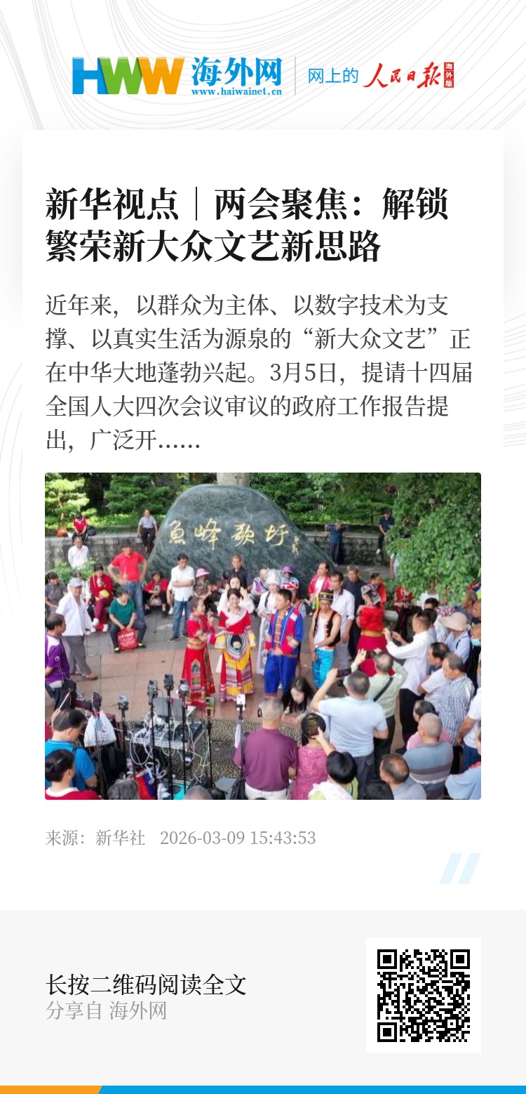 3月5日,提请十四届全国人大四次会议审议的政府工作报告提出,广泛开展群众性文化活动,繁荣互联网条件下新大众文艺,引发广泛热议。