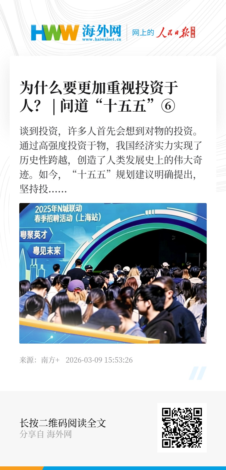 通过高强度投资于物,我国经济实力实现了历史性跨越,创造了人类发展史上的伟大奇迹。如今,“十五五”规划建议明确提出,坚持投资于物和投资于人紧密结合,将投资于人放在更突出的位置。