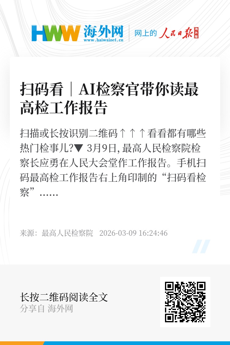 据了解,扫码看报告形式,最高检已经做了9年。鉴于最高检工作报告篇幅超过1万字、专业性强,“扫码看检察”视频以视听语言化繁为简,成为服务代表委员履职的贴心窗口。据最高检新闻办负责人介绍,为确保这近6分钟的精彩呈现,最高检新闻办与相关技术团队靠前谋划,围绕主题立意、叙事架构、数字赋能及表达创新等维度开展多轮研讨,精细打磨每一处场景转化、镜头运用等细节,最终确保视频高标准、高质量呈现在代表委员及大众眼前。