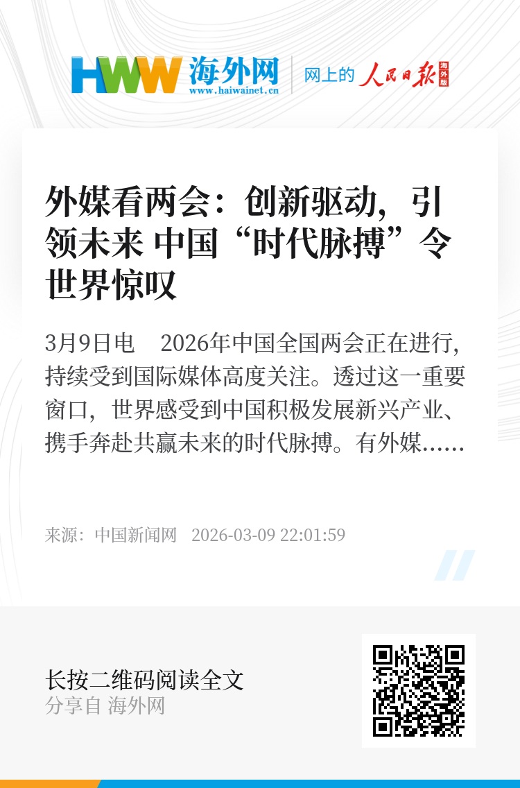 中新网3月9日电 2026年中国全国两会正在进行,持续受到国际媒体高度关注。透过这一重要窗口,世界感受到中国积极发展新兴产业、携手奔赴共赢未来的时代脉搏。有外媒评论称,“世界动荡之际,是中国引领未来。中国发生的一切都会对世界产生连锁反应,每一个决定都会直接或间接地影响所有人。”