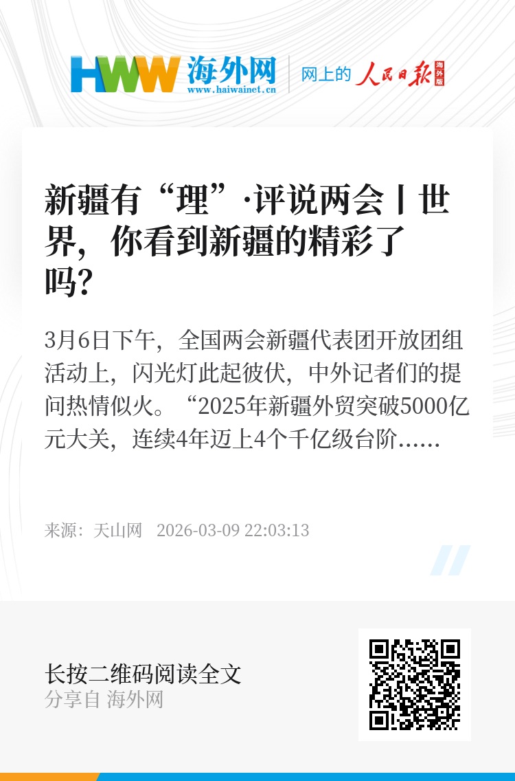 3月6日下午,全国两会新疆代表团开放团组活动上,闪光灯此起彼伏,中外记者们的提问热情似火。“2025年新疆外贸突破5000亿元大关,连续4年迈上4个千亿级台阶,在当前外部环境复杂多变的情况下,新疆是怎么做到的?”“新疆被网民亲切称为‘超级绿色充电宝’,下一步如何更好服务国家能源安全和‘双碳’目标”……一个个问题,透露出海内外各界对这片广袤土地的浓厚兴趣。本期《新疆有“理”·评说两会》为你解读。