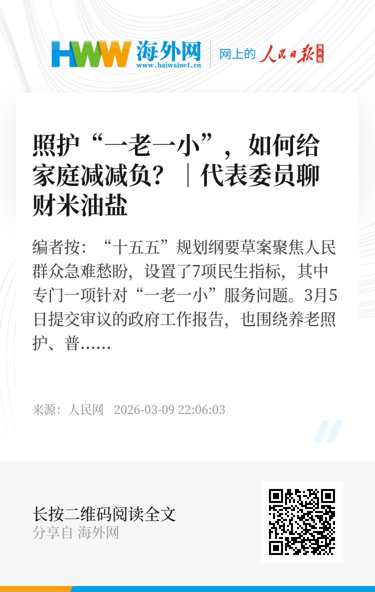 编者按:“十五五”规划纲要草案聚焦人民群众急难愁盼,设置了7项民生指标,其中专门一项针对“一老一小”服务问题。3月5日提交审议的政府工作报告,也围绕养老照护、普惠托育等具体方面作出部署。“一老一小”是每个家庭的核心关切。如何切实减轻家庭照护负担?带着相关问题,“财米油盐”栏目和代表委员们聊了聊。