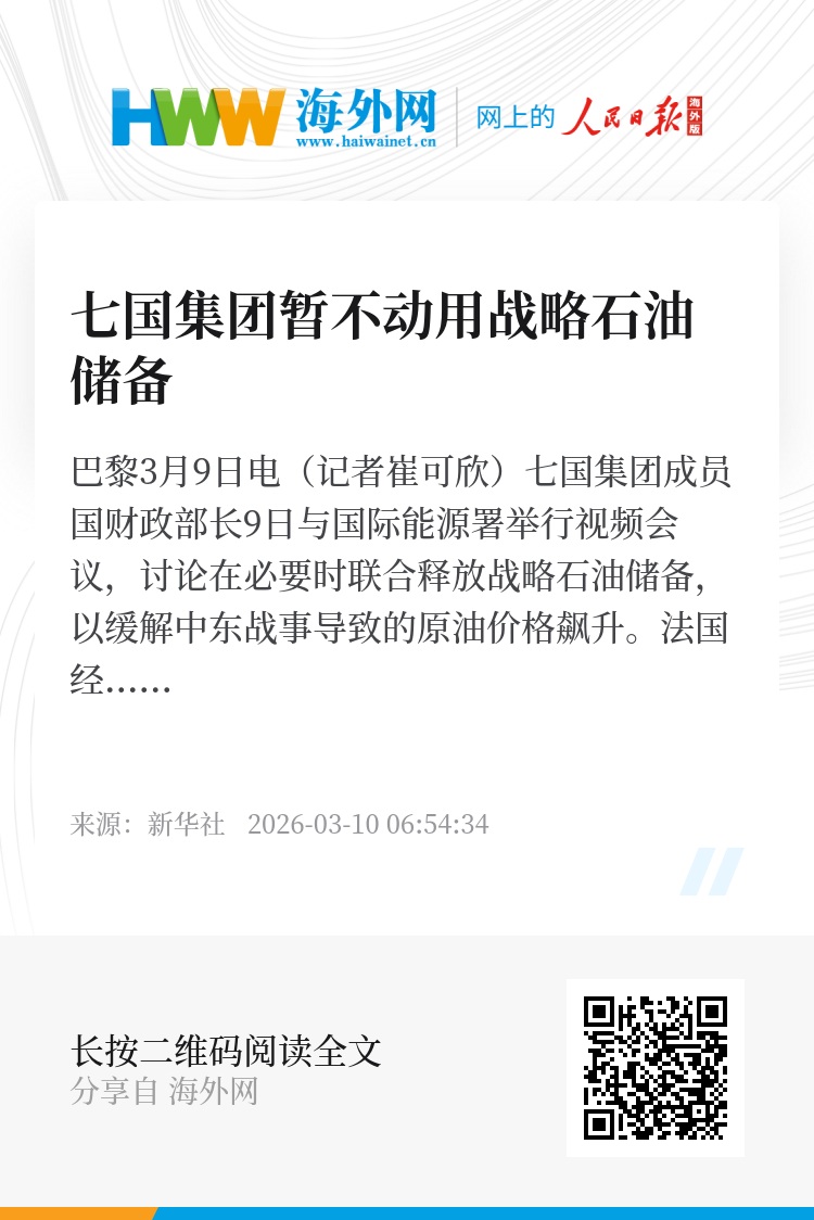 新华社巴黎3月9日电(记者崔可欣)七国集团成员国财政部长9日与国际能源署举行视频会议,讨论在必要时联合释放战略石油储备,以缓解中东战事导致的原油价格飙升。法国经济与财政部长罗兰·莱斯屈尔表示,与会方认为,目前不会出现供应短缺,“尚未到采取行动的时候”。