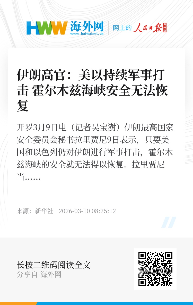 新华社开罗3月9日电(记者吴宝澍)伊朗最高国家安全委员会秘书拉里贾尼9日表示,只要美国和以色列仍对伊朗进行军事打击,霍尔木兹海峡的安全就无法得以恢复。