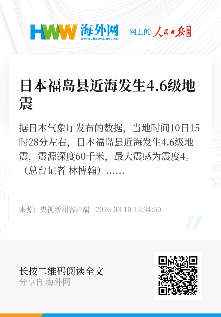 据日本气象厅发布的数据,当地时间10日15时28分左右,日本福岛县近海发生4.6级地震,震源深度60千米,最大震感为震度4。(总台记者 林博翰)