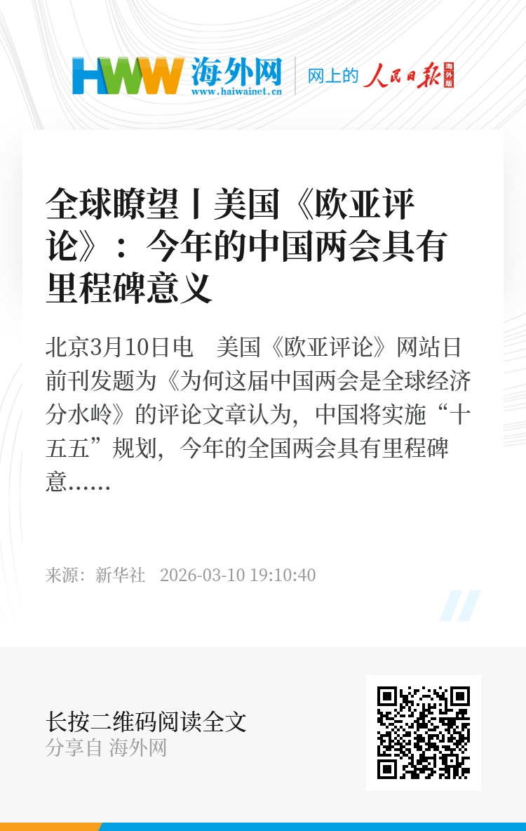 新华社北京3月10日电 美国《欧亚评论》网站日前刊发题为《为何这届中国两会是全球经济分水岭》的评论文章认为,中国将实施“十五五”规划,今年的全国两会具有里程碑意义。“十五五”规划纲要草案所描绘的蓝图表明,中国对未来有着清晰的认识,并已做好引领21世纪产业发展的准备。文章摘要如下:
