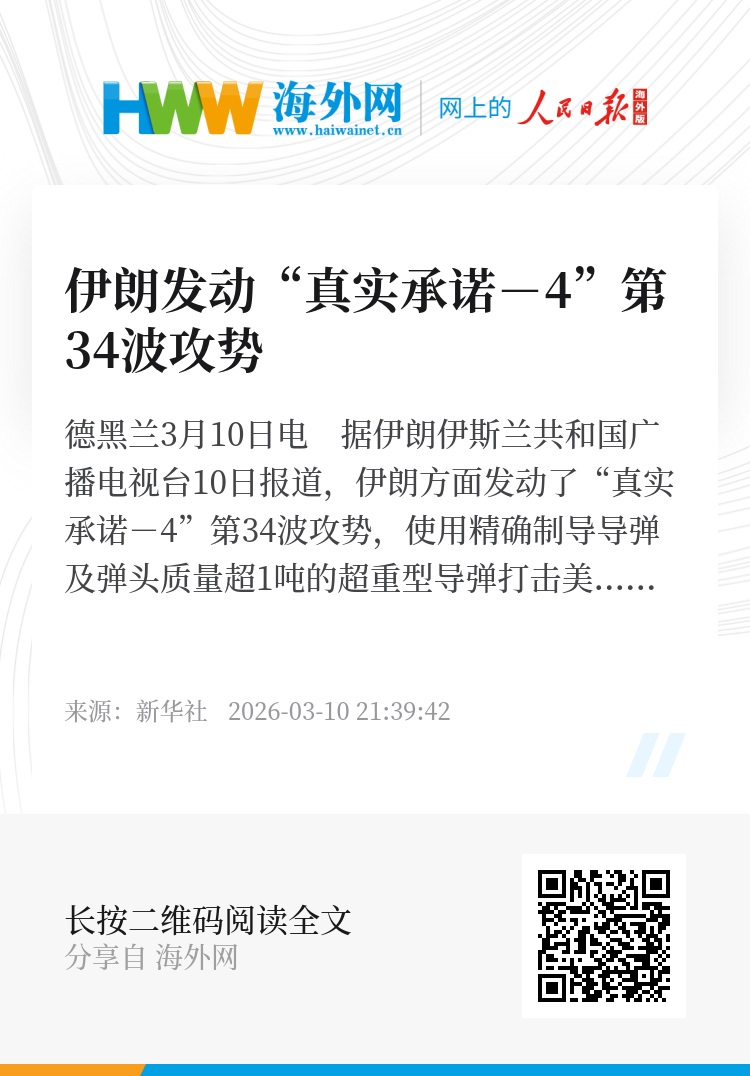 新华社德黑兰3月10日电 据伊朗伊斯兰共和国广播电视台10日报道,伊朗方面发动了“真实承诺-4”第34波攻势,使用精确制导导弹及弹头质量超1吨的超重型导弹打击美国和以色列的军事基地。