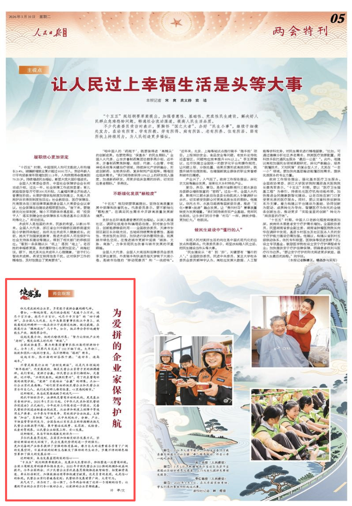 “十五五”规划纲要草案提出,发展壮大民营经济,积极营造一流营商环境。全国工商联发布的榜单和报告显示,2025年中国民营企业500强的规模和效益双提升。今年全国两会,不少民营企业家代表委员围绕推进数智转型、拓宽融资渠道、牵头标准制定、加强数据治理等积极建言献策。这是负责的表现,也是信心的体现。民营企业家们普遍感受到:民营经济发展前景广阔、大有可为。