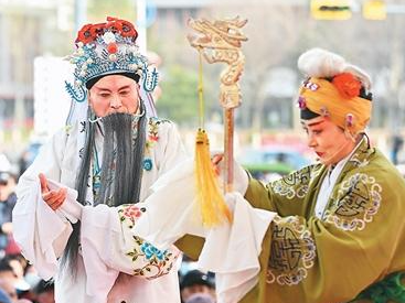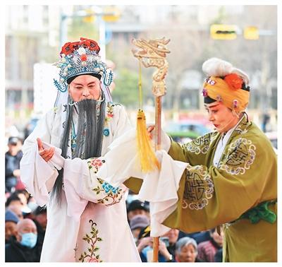 在山东省滕州市2026年文化惠民专场演出活动现场,当地艺术团为群众演出豫剧《穆桂英挂帅》,让群众乐享戏曲“大餐”。